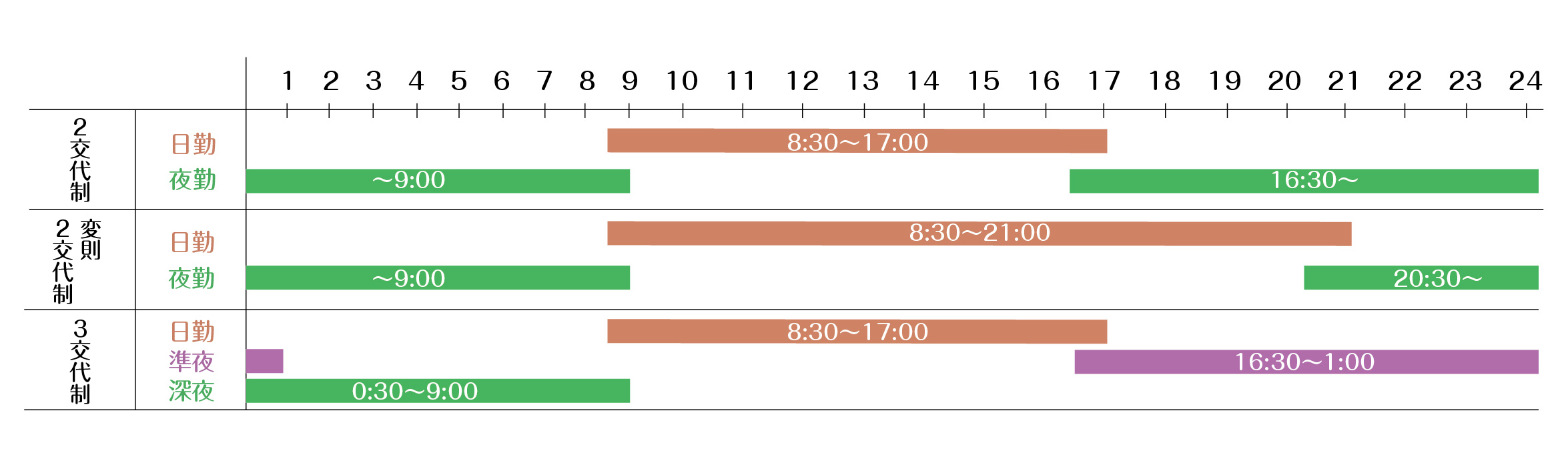看護体制 セル看護提供方式日勤のスケジュール 8:30 情報収集・準備 ・環境整備 ・今日の予定や報告事項の伝達 ・患者さんの情報収集、薬や点滴の準備 9:00 患者ラウンド ・患者状態観察 ・担当患者さんに挨拶 ・清潔ケア、点滴 ・バイタルサイン測定 ・カルテ記載 11:30 昼休憩 ・11:30から交代で1時間 ・職員食堂でランチタイム 12:00 食事の準備・介助 ・配膳、下膳 ・食事介助、配薬 ・口腔ケア 13:00 患者ラウンド ・患者状態観察 ・カルテ記載 15:00 クリーンタイム / カンファレンス ・環境整備 ・患者さんの情報を共有、計画の変更 17:00 業務終了 交代勤務・シフト制 PAGE TOP WEB 申込み 病院見学 オープン ホスピタル Instagram お問合せ 看護部概要 看護部 認定看護師 看護実践 データで見る看護部 教育体制 教育方針等 教育システム 教育プログラム 新人看護師研修 IVナース制度 イベント 病院見学 インターンシップ等 福利厚生 採用情報 アクセス お問合せ