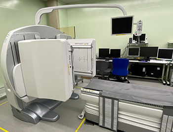 放射性同位元素と呼ばれる放射線を出す物質を含んだ薬品(放射性医薬品)を注射し、その薬から出る放射線を専用のカメラで撮像する検査です。投与後は、装置のベッドに寝ていただき検査を行います。検査時間は多くの場合30分以上かかりますが、息止めなどしていただくことはありません。