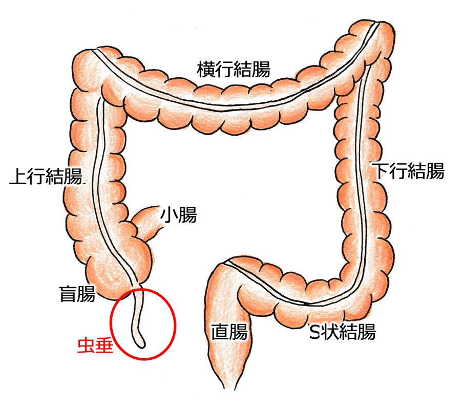 小腸と大腸の境が 右下腹部にありますが、この境目近くの大腸(盲腸)から出ている部分が虫垂と呼ばれています。人間では虫垂は退化しており、ほとんど何の働きもしていないとされています。正常の虫垂は、太さは 4~5mm、長さは 5~8cm 程度です(赤ちゃんの小指程度の大きさ)。