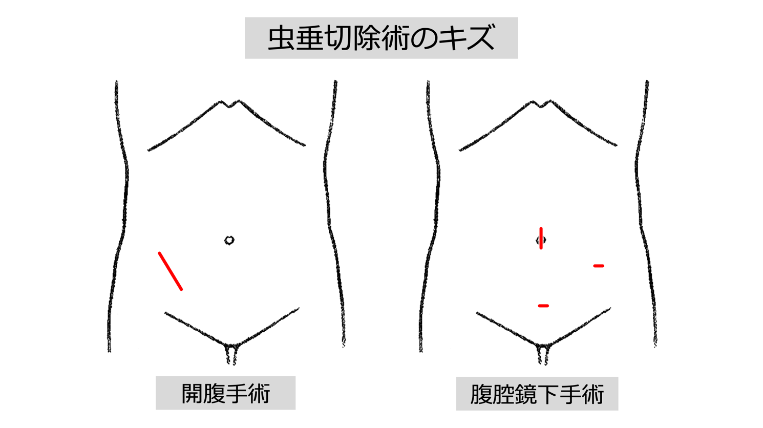 急性虫垂炎の手術は、下図のように下腹部を斜めに約 5 ~10cm切って行う手術 (開腹術)が一般的でしたが、最近は腹腔鏡を用いた手術を行うことのほうがむしろ多くなってきました。腹腔鏡の手術は、全身麻酔をかけた上で腹部に 3~4 箇所の 5mm から 12mm の穴をあけ、そこから内視鏡と手術用の器具を挿入し、テレビモニターを見ながら行う手術です(腹腔鏡下虫垂切除術)。また、最近では腹腔鏡下手術においてもより手術による生体への影響を減らすことを目的に、臍に開けた一個の穴から手術を行う単孔式腹腔鏡下手術が様々な疾患に導入されています。急性虫垂炎に対しても単孔式腹腔鏡下虫垂切除術を導入する施設が増えてきており、当院でも適応があり希望される患者さんには単孔式腹腔鏡下手術を行っています。