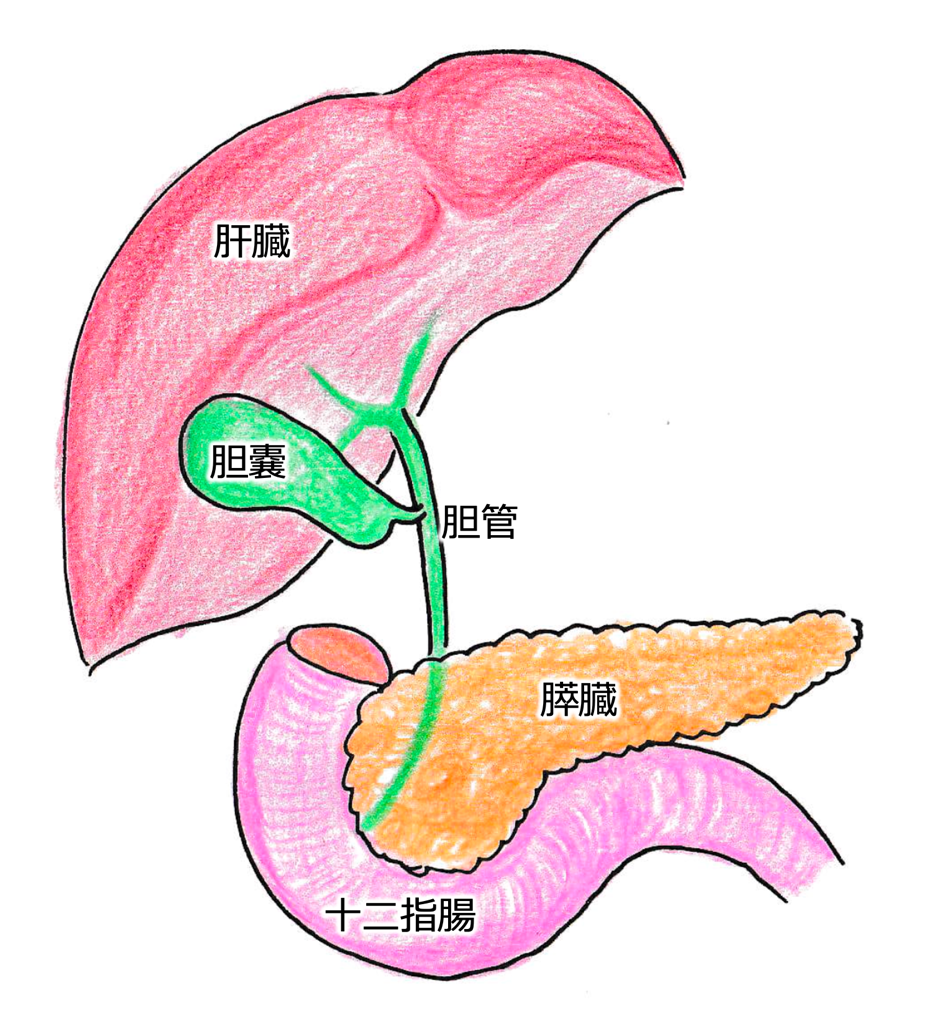 胆嚢はちょうどナスのような形の袋状の臓器で、肝臓の下に張り付くように位置しています。肝臓で作られた胆汁を十二指腸へ運ぶ胆管という管の途中にあります。胆嚢は、胆汁を50~60ml蓄えることができ、また蓄えている間に胆汁を5~10倍に濃縮します。胆汁は脂肪の消化を助ける働きがあります。食事が十二指腸に達すると、胆嚢が収縮し、胆汁が十二指腸へ送り出されます。