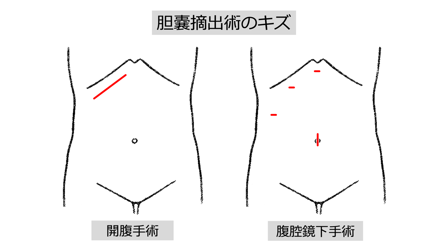 開腹手術では、お腹に10~15㎝の創を設け、胆嚢を直接見て触れながら手術を行います。前述のように手術中の判断で腹腔鏡手術から開腹手術へ移行することもありますが、①これまでにお臍より上で開腹手術を受けたことのある場合②進行した胆嚢癌が強く疑われる、などでは最初から開腹手術を予定することもあります。