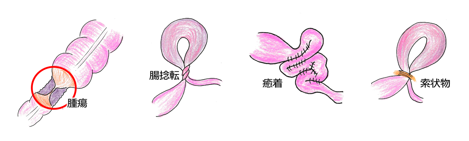 - 過去の腹部手術で腸同士の癒着が起きる(癒着性腸閉塞)