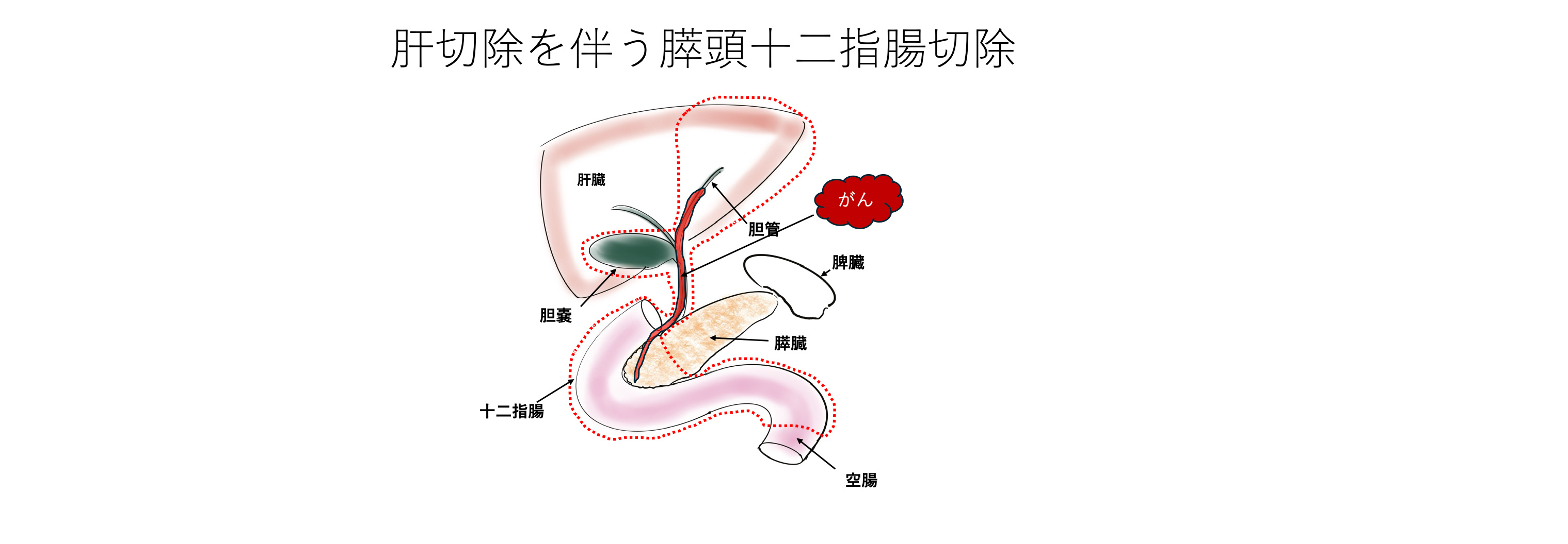 肝臓に近い部分(近位側胆管癌)では、肝臓内の胆管まで癌の進展がある可能性があり、肝切除が必要になることがあります。しかし、肝外胆管癌は十二指腸側まで癌が進展していることがあり、この場合膵頭十二指腸切除を追加する必要があります。