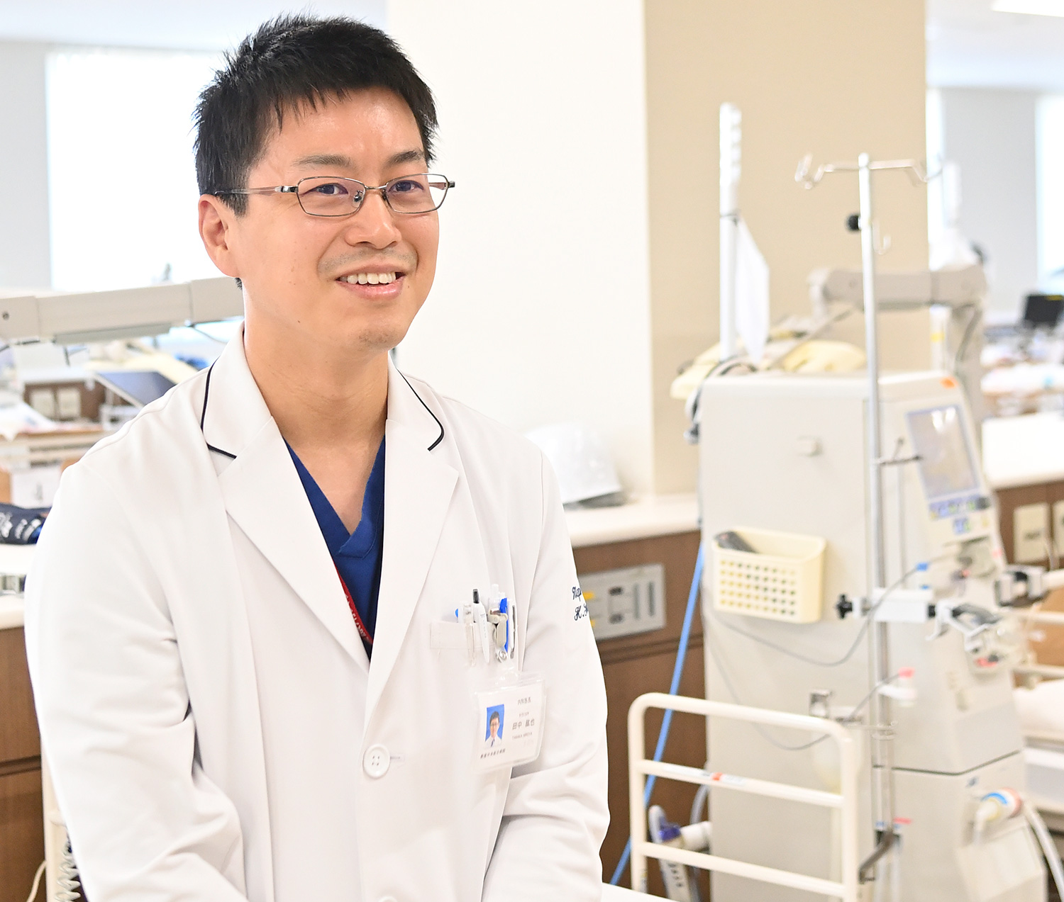CKD(慢性腎臓病)の治療においては、薬剤だけでなく食事療法や運動療法、生活習慣の見直しなどが重要です。このため当科ではCKD精査教育入院を通じて、患者さんに自分の疾患に関する知識を学んで頂き、腎臓病との「付き合い方」を身に付けて頂くことを行っています。また慢性糸球体腎炎やネフローゼ症候群などに対しては積極的に腎生検を行って診断を行い、免疫抑制療法を中心とした治療で腎機能の悪化を防ぎます。腎機能が最終段階まで悪化した患者さん(末期腎不全)には、適切なタイミングで透析や腎移植(腎代替療法)の相談や準備を行い、スムーズな腎代替療法への移行を目指しています。維持透析となった後も、総合病院の強みである多くの診療科と連携した合併症の検索・治療を行い、元気で長生きして頂けるように努めています。
