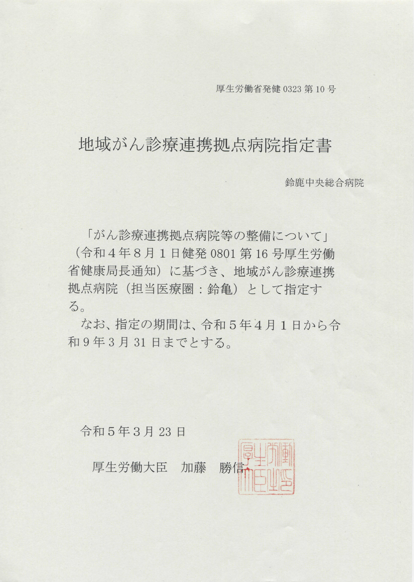 当院は、平成21年(2009年)に「地域がん診療連携拠点病院」として指定をうけました。以降、専門的ながん医療の提供、がん診療の地域連携協力体制の構築、がん患者・家族に対する相談支援及び情報提供等を行っています。