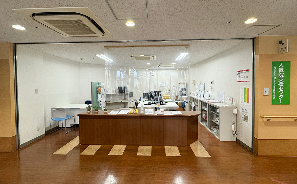 入退院支援センターでは、地域の皆さんが安心して治療や療養ができ、早期に住み慣れた地域で生活ができるように、入院前から退院後の生活を見据えた支援を行っています。看護師は、入院前の生活背景を伺うとともに、治療や入院生活について説明を行い、患者さんやご家族が安心して入院生活を過ごせるよう努めています。また、当センターは玄関ホール近くに位置しているため、いつも顔の見える関係を大切に、日々患者さんやご家族の方々をサポートしています。