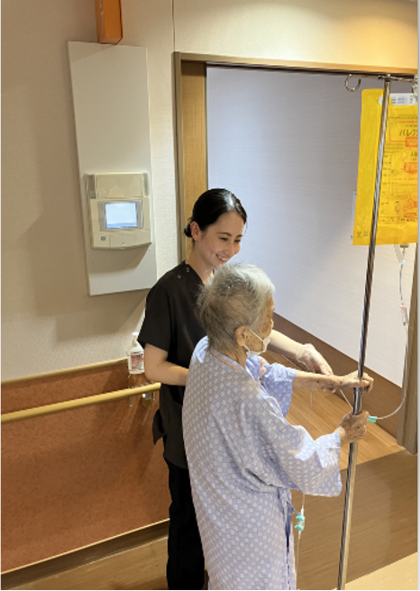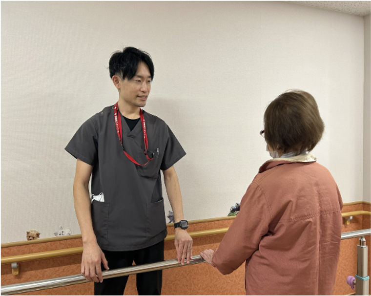 回復期リハビリテーション病棟は、心身ともに回復した状態で、在宅・社会復帰を目指しながら、集中的なリハビリテーションを行うことができる、当院で最もアクティブな病棟です。一般病棟と比べると、活動量の多さに驚く患者さんもたくさんいらっしゃいます。日常生活動作そのものをリハビリと捉えて生活援助を行い、患者さんとゴールを共有しながら、退院後の生活を見据えた支援をしています。入院時、車いすだった患者さんが歩いて退院する姿に、看護師としてやりがいを感じると共に、患者さんの力強さに励まされています。